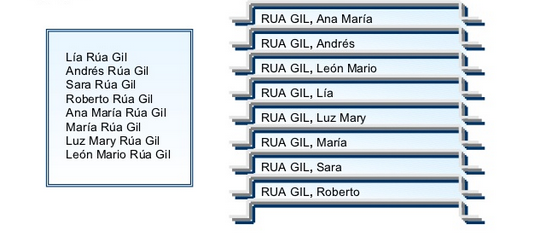 1- Nombres de individuos.  Se invierte el nombre de cada individuo, considerando en primer lugar el apellido paterno, seguido del nombre de pila y en tercer lugar el segundo nombre o inicial, si existiere. Ejemplo: Maria Elena Salas. quedará así: